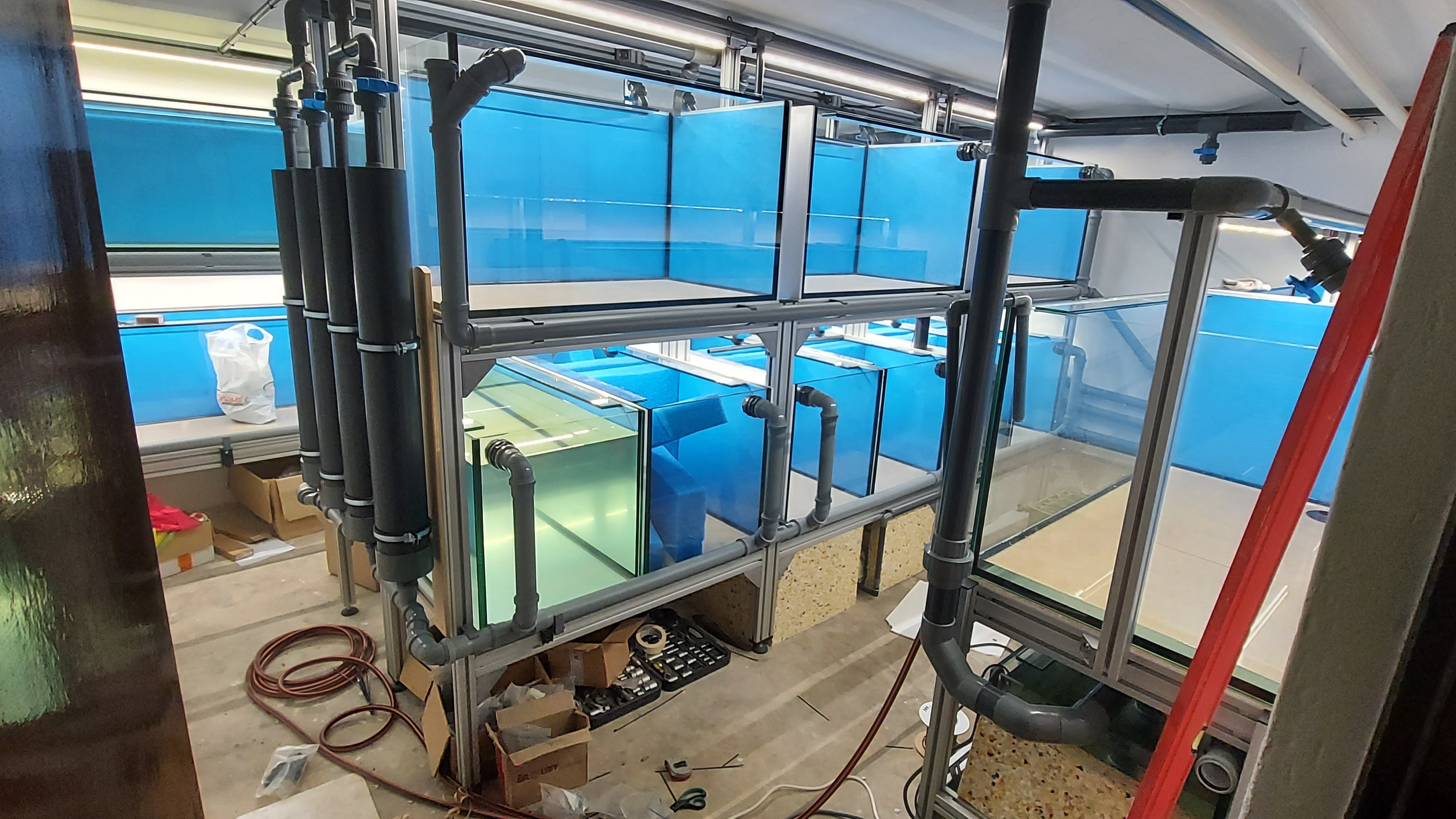 Po dokončení montáže prvního stojanu přišla na řadu samotná akvária. Už od začátku jsem měl jasnou představu – chtěl jsem robustní a kvalitní nádrže, které vydrží dlouhá léta. Rozhodl jsem se pro osvědčenou firmu Sklorex, kterou snad není třeba akvaristům představovat. Jsou to skuteční profesionálové, kteří své práci rozumí. Spolupráce s nimi byla skvělá, od návrhu přes výrobu až po dodání.