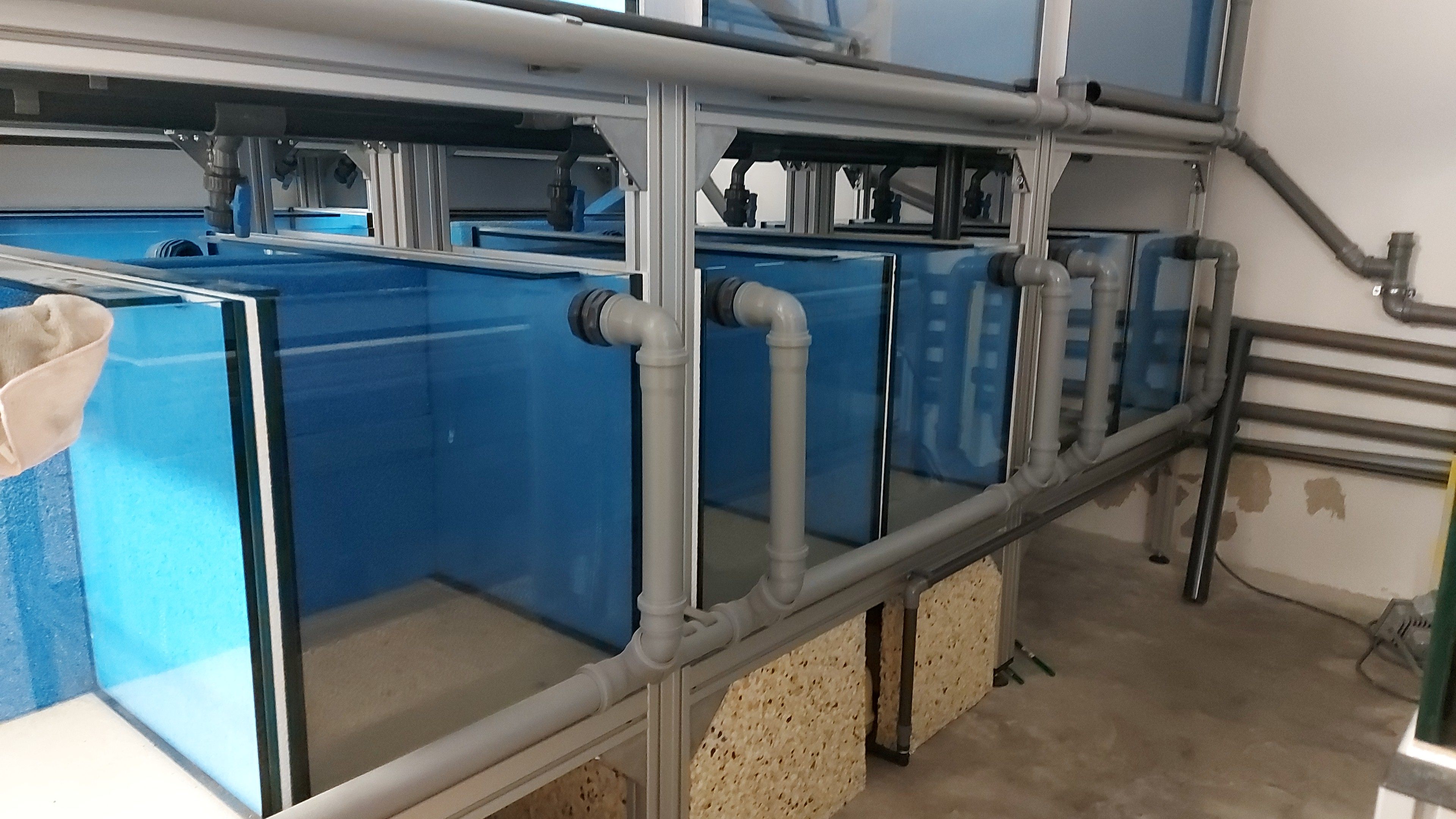 Rozvody vody z filtru k jednotlivým akváriím jsou vedeny slepeným potrubím z PVC-U, což zaručuje vysokou odolnost a těsnost. Přítok vody do akvárií je regulován kulovými ventily, což mi umožňuje individuálně nastavit průtok pro každou nádrž či ji úplně odstavit od systému např. pro potřeby karantény nových ryb.